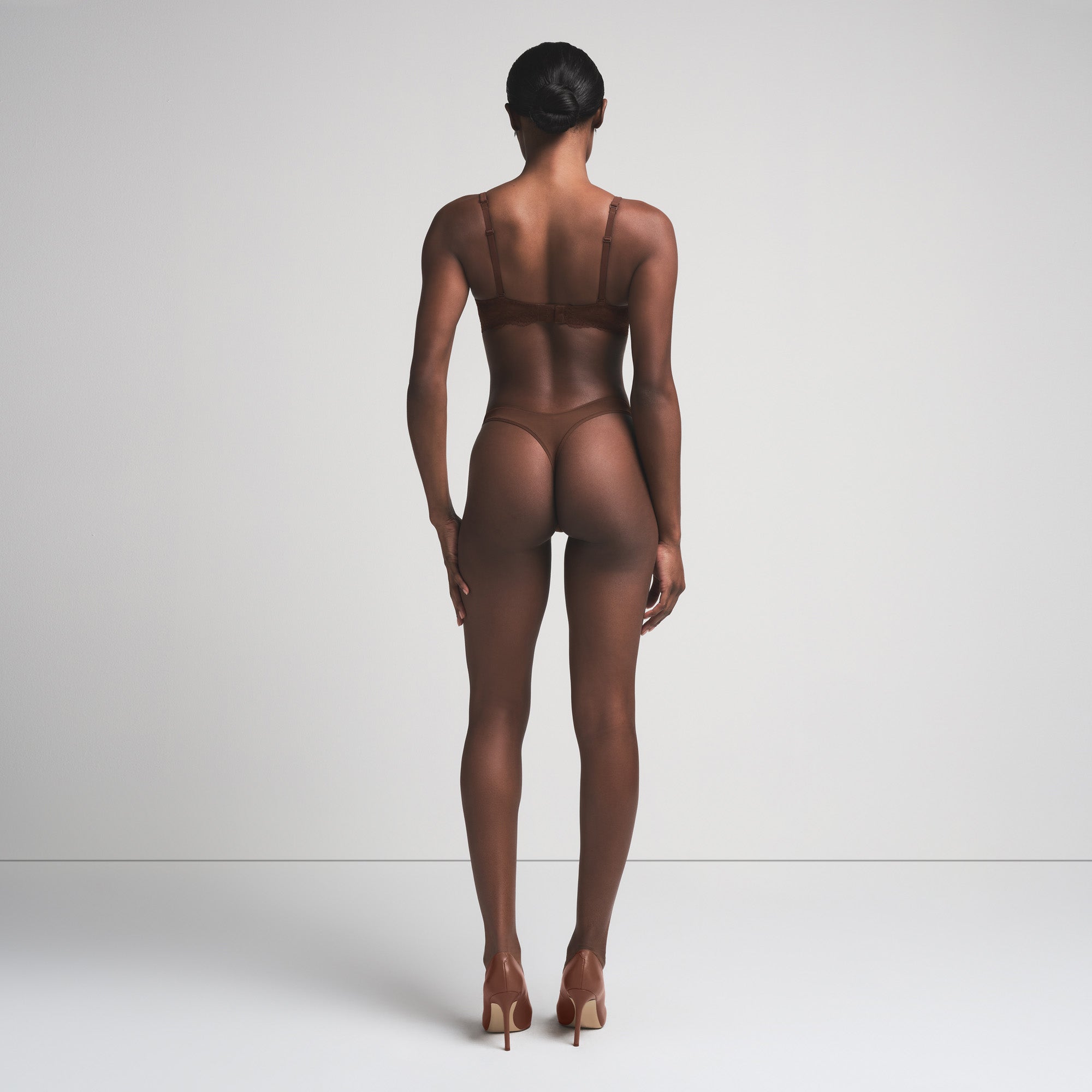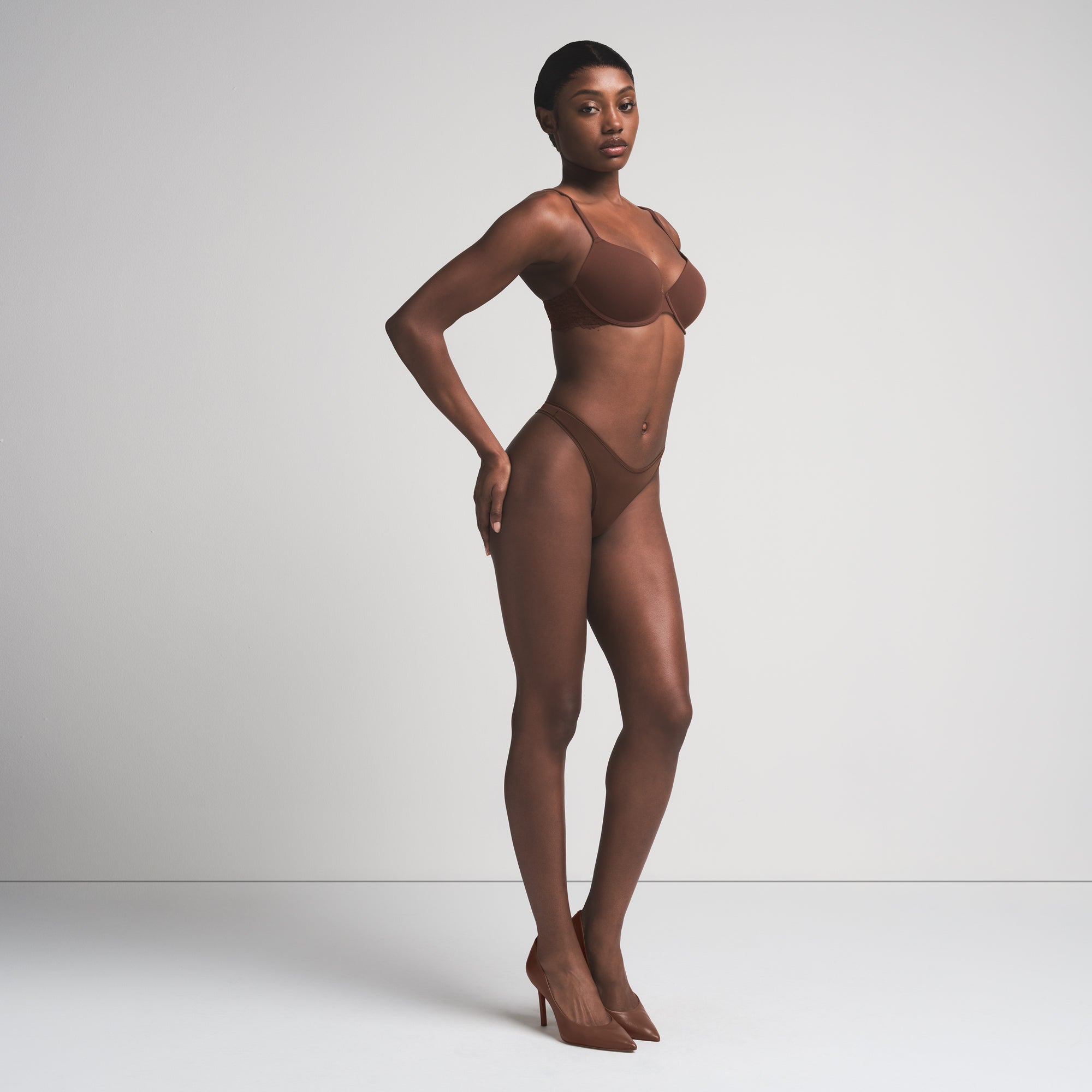 Our signature Fits Everybody T-Shirt Bra, reinvented with a sexy lace wing and scalloped edge finish. This demi bra features lightly lined foam cups and a flexible underwire for support. Complete with 360-stretch technology for a custom fit when between sizes, adjustable elastic straps, and a hook and eye back closure. Fits true to your SKIMS bra size.