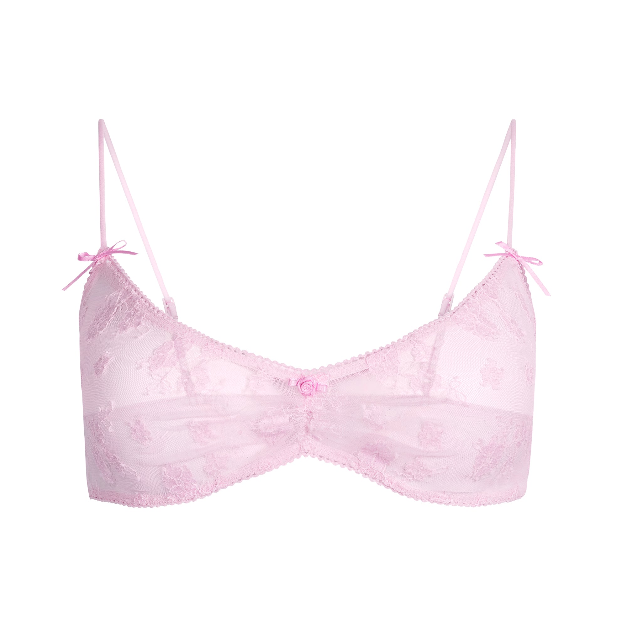 Designed in our two-toned lace, this scoop bra makes a sexy statement with center ruching, delicate picot trim, and rosette and bow detailing. This pullover style features thin, adjustable straps and fits true to size.
