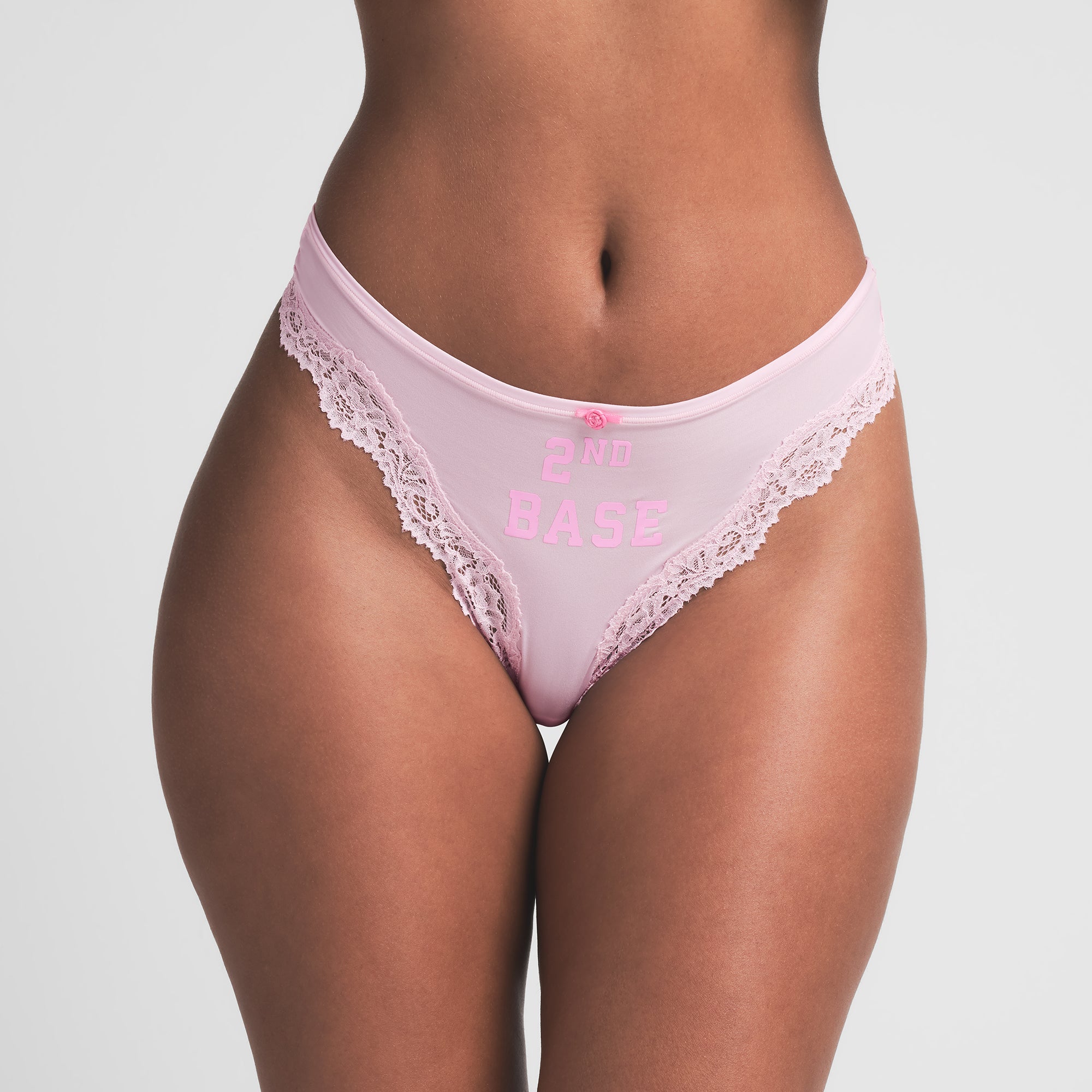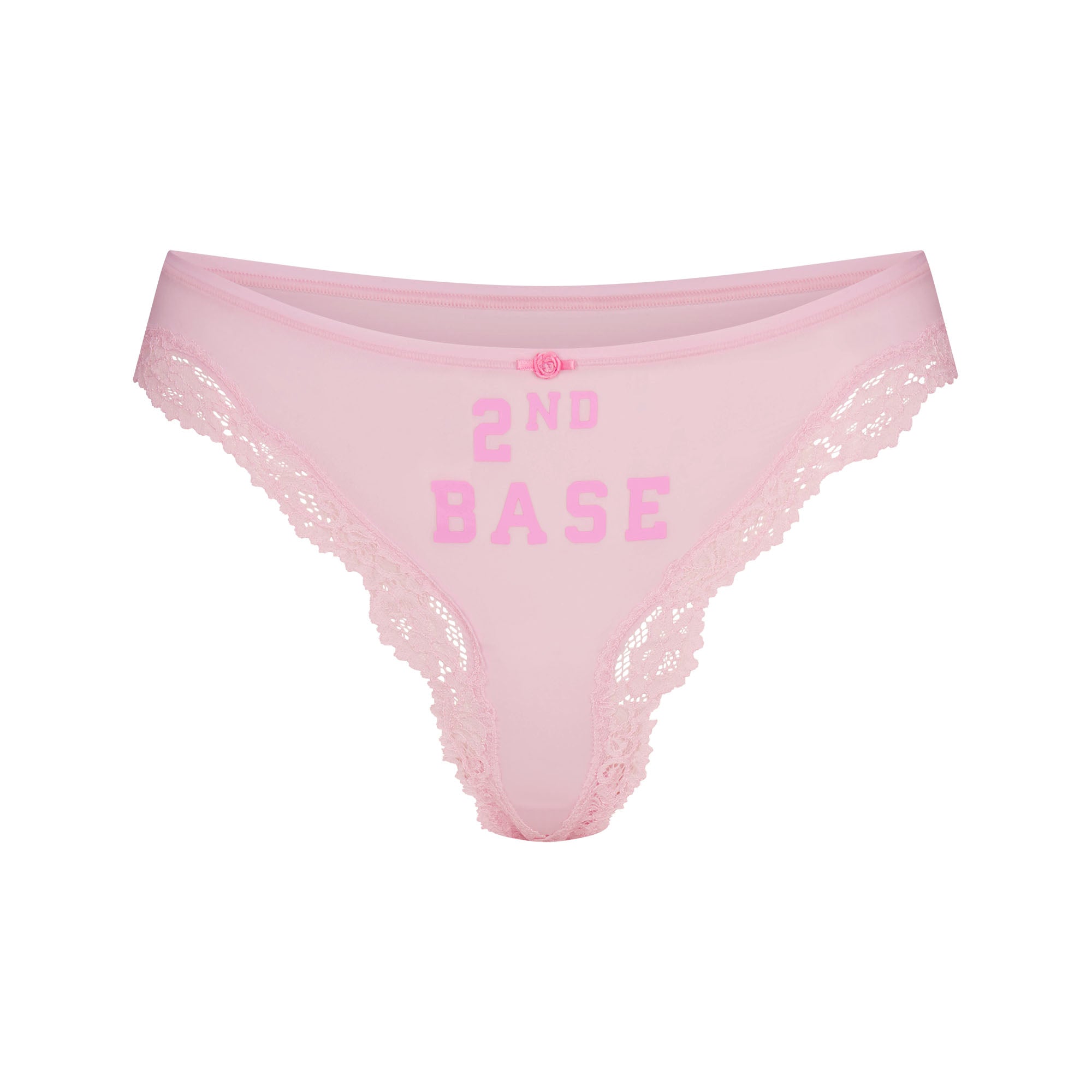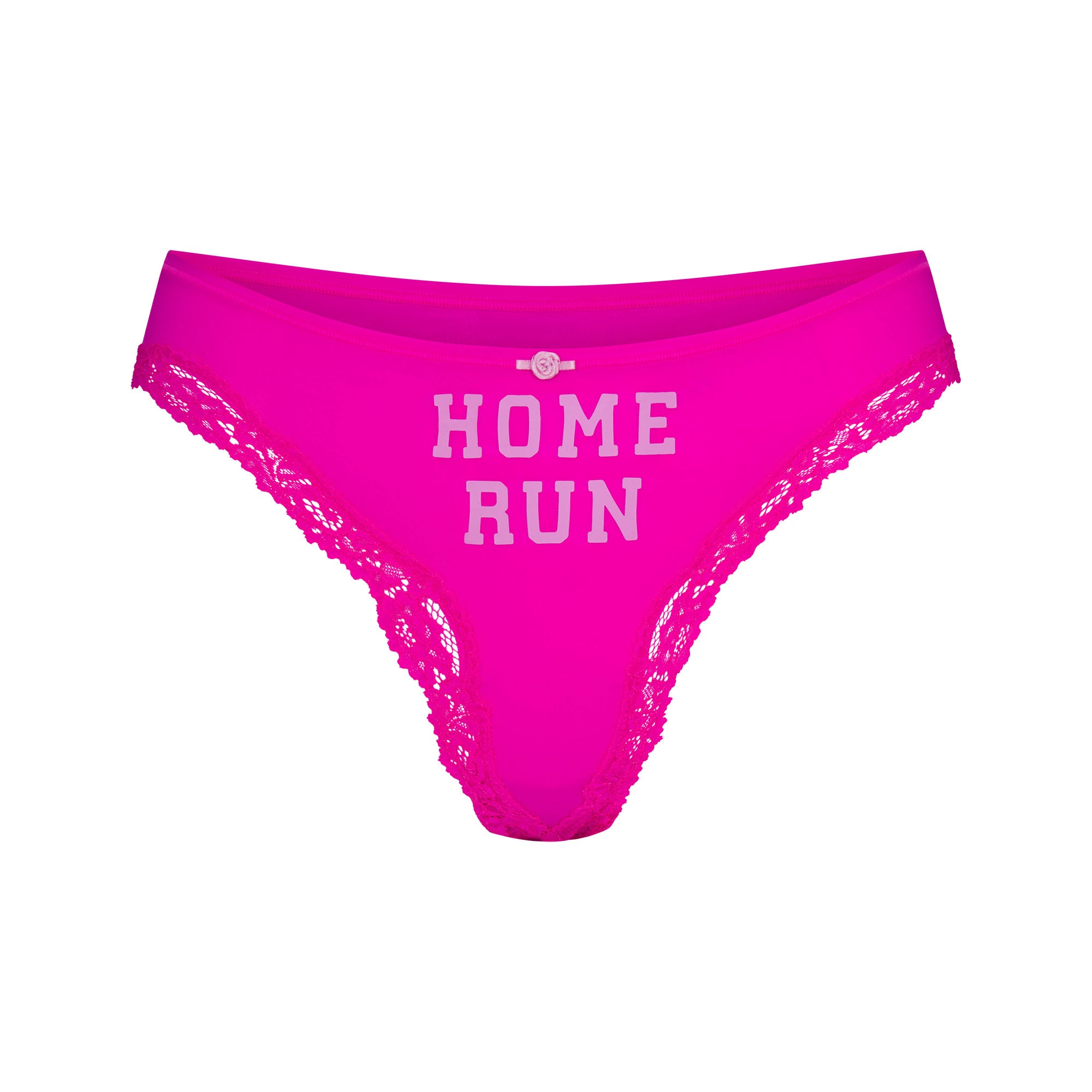 These panties are a home run. Turn up the heat with a sporty, sultry update to our classic Fits Everybody Lace thong and bikini foundations. This buttery-soft assortment includes three bikinis and two thongs, each complete with printed phrases, dainty lace trim, and a 100% cotton gusset.