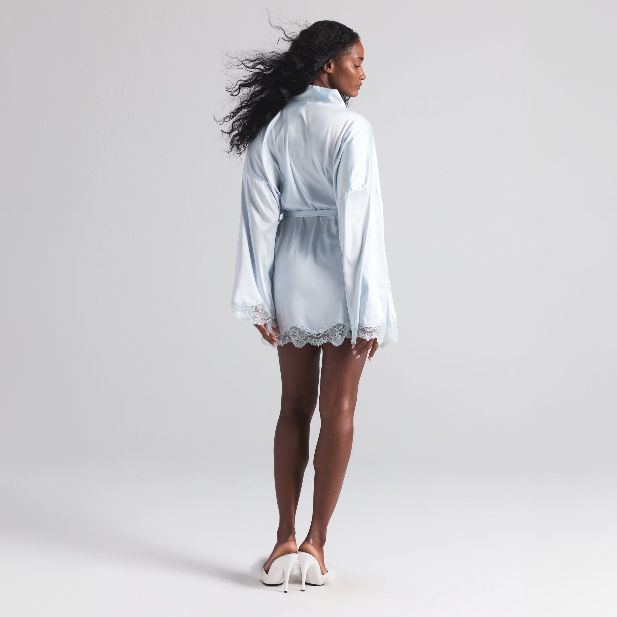 Pampered by SKIMS. This short robe is made with our satiny-smooth Woven Shine fabric for elevated comfort when you’re getting ready. Features oversized sleeves, dainty lace trim, and a self tie at the waist. Fits true to size.