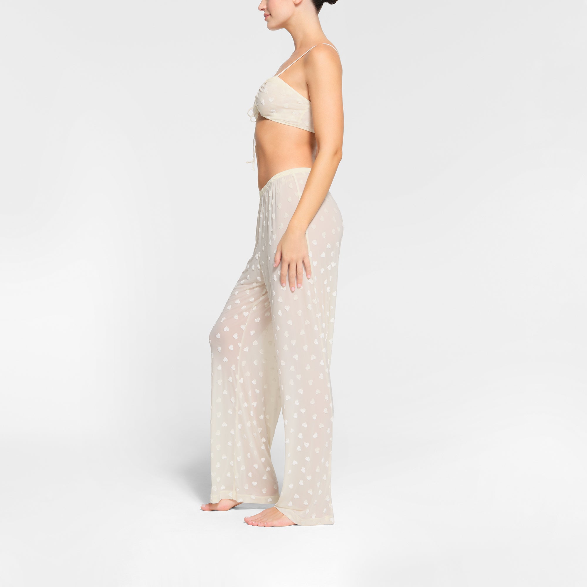 A bralette as sexy as it is comfortable. Made with a soft, sheer fabric, this sleep top has an all-over velvet heart print you’ll be sweet on. Features a feminine scoop neck that ties in the front and adjustable straps that stretch for the perfect fit. Fits true to size.