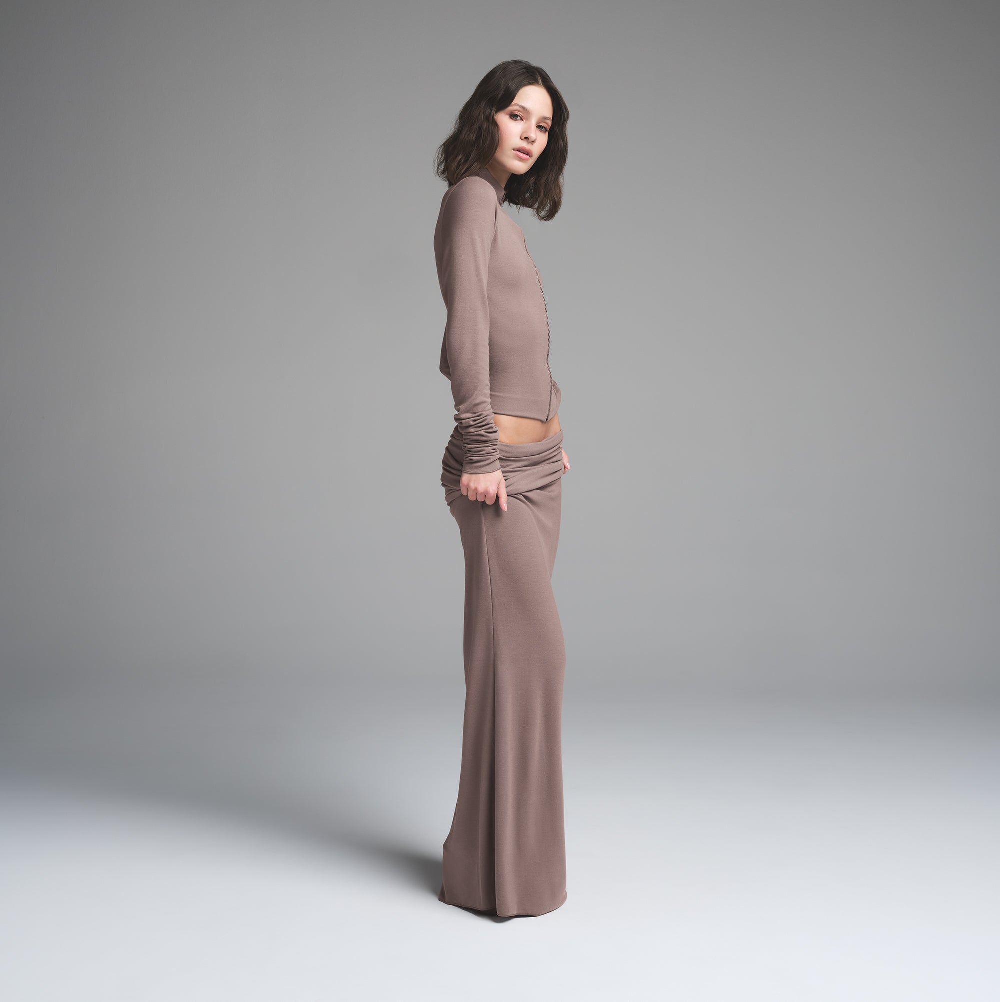 Plush comfort meets refined style in this fitted zip-up top. Made from an ultra-soft, lightweight cloudlike fabric, this top boasts exaggerated long sleeves and a sleek mock neck for a chic, elevated look. Fits true to size.