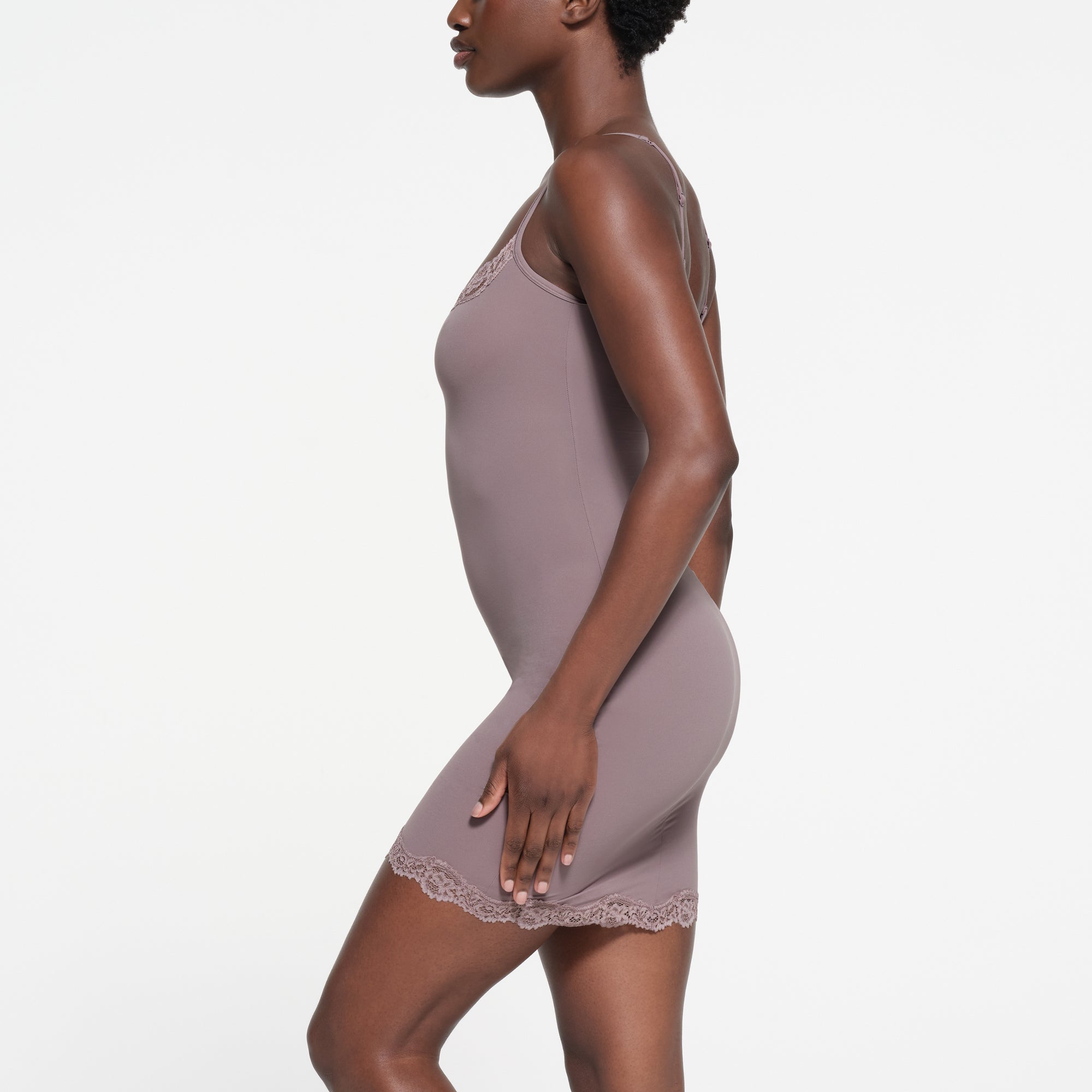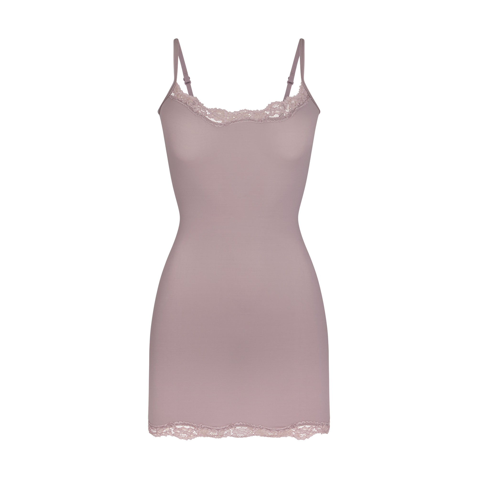 Slip into this buttery-soft, body-hugging mini dress with romantic stretchy lace trims. Features a front scoop neckline and adjustable straps. Fits true to size.