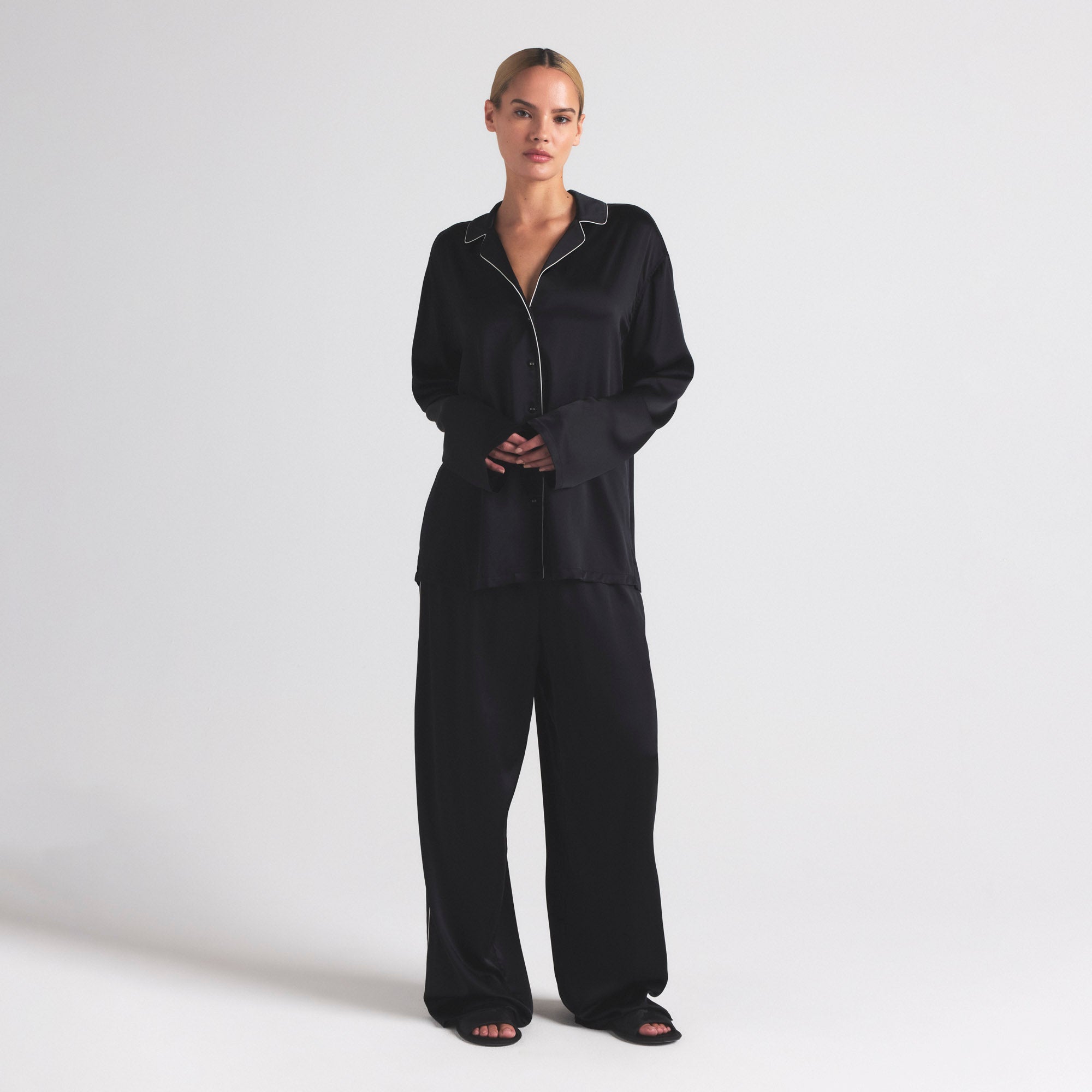 Dream in SKIMS. Made in our signature fabric with a luxurious feel, this chic two-piece includes a long sleeve button-up and straight leg pant with contrast stitching details for an elevated look. Features a front chest pocket and fits true to size.
