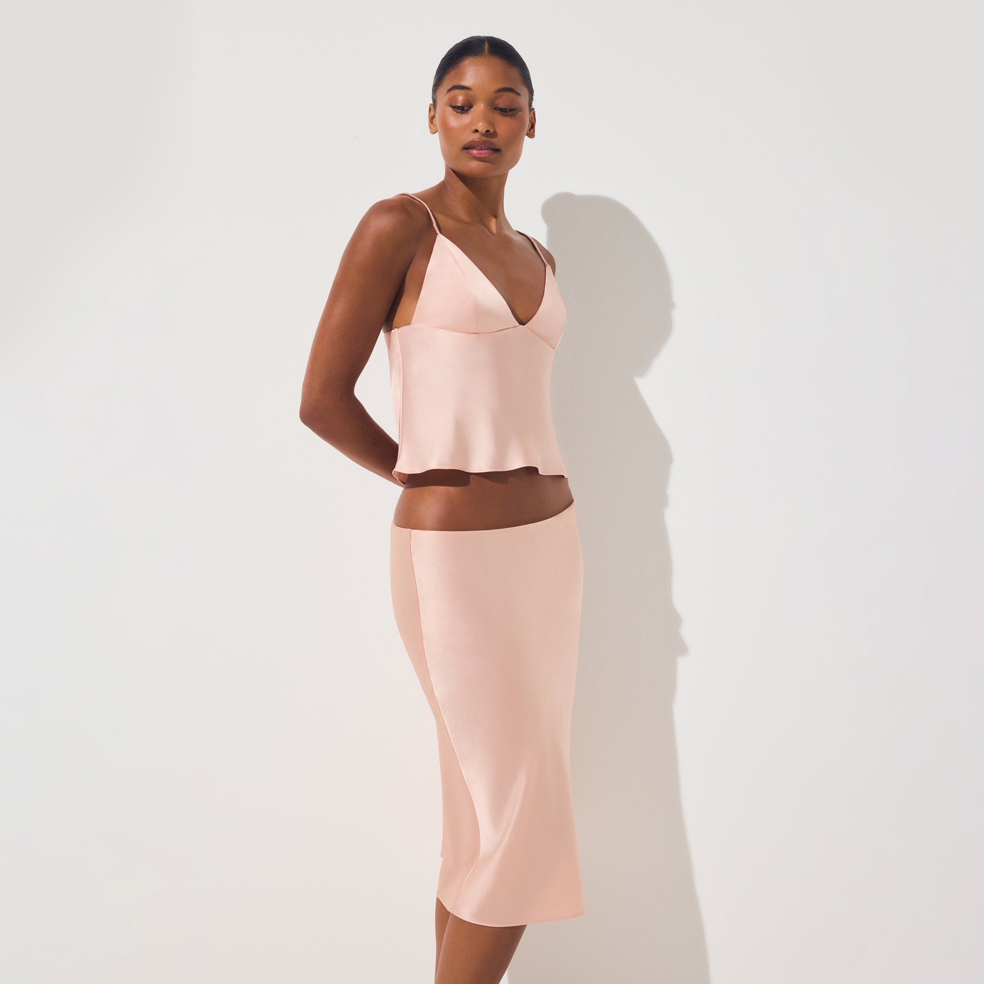 Silky smooth, effortlessly chic. This statement-making midi skirt is designed in our signature silk fabric and features an elastic waistband for comfort. Hits below the knee and fits true to size.