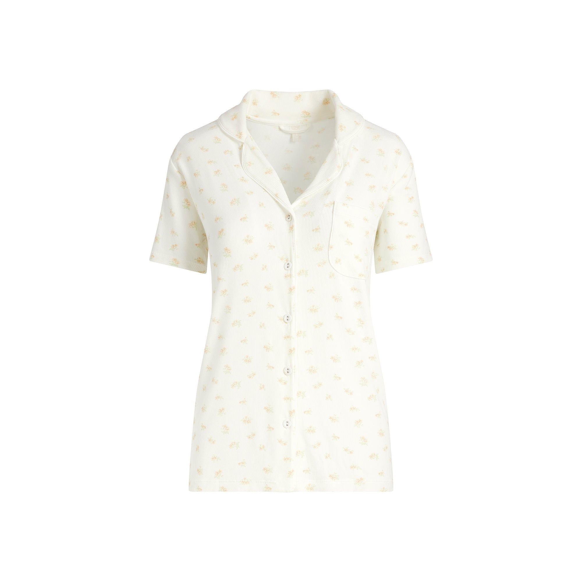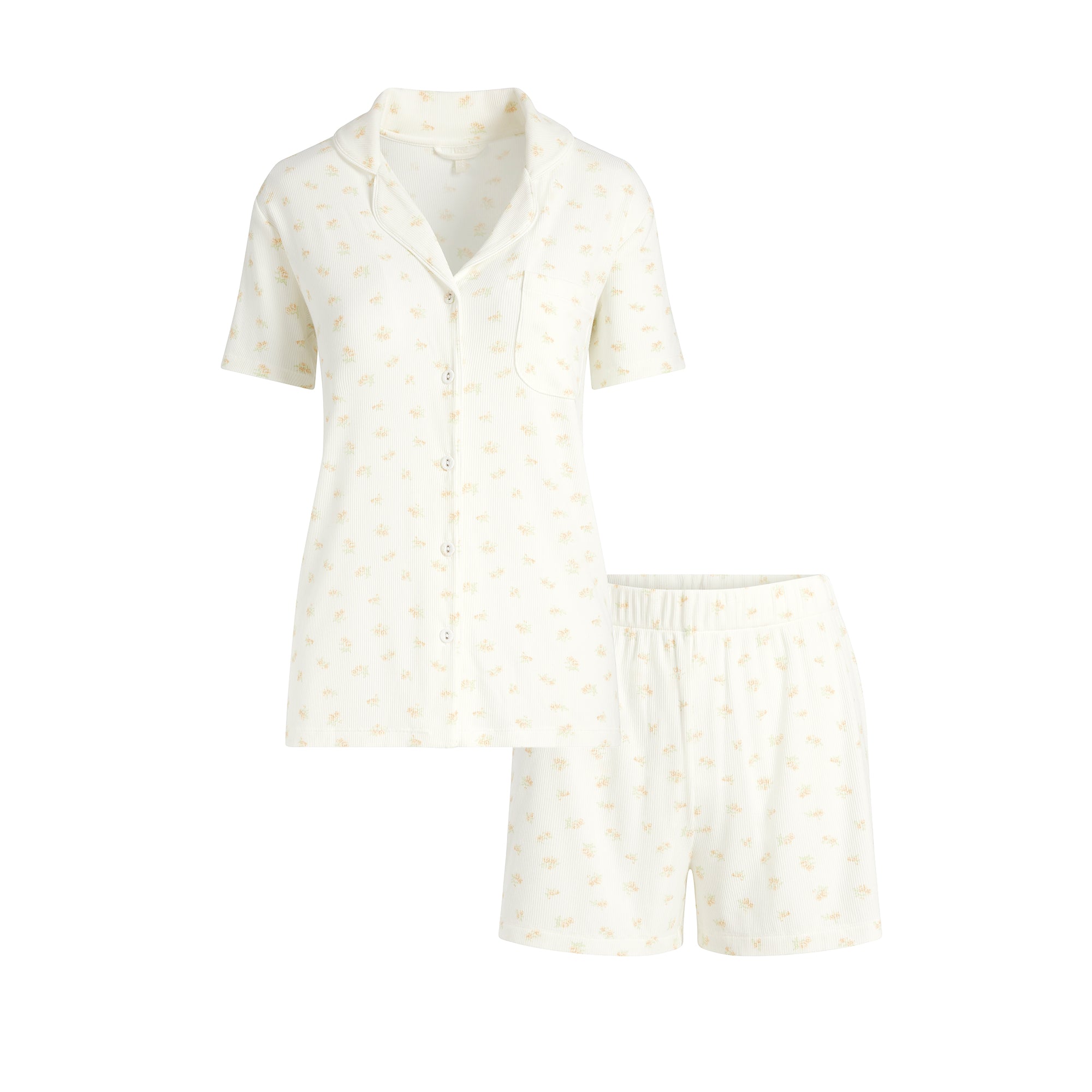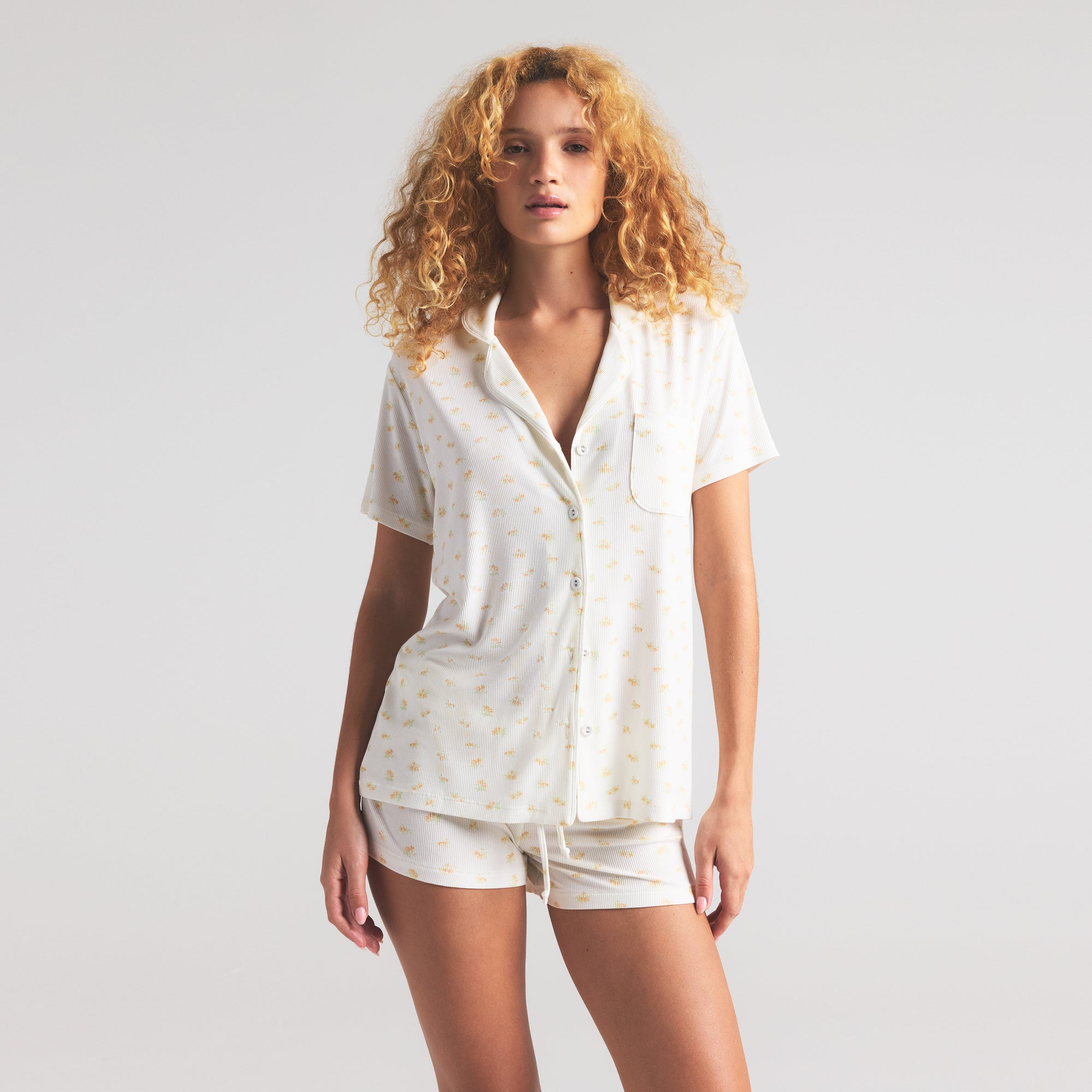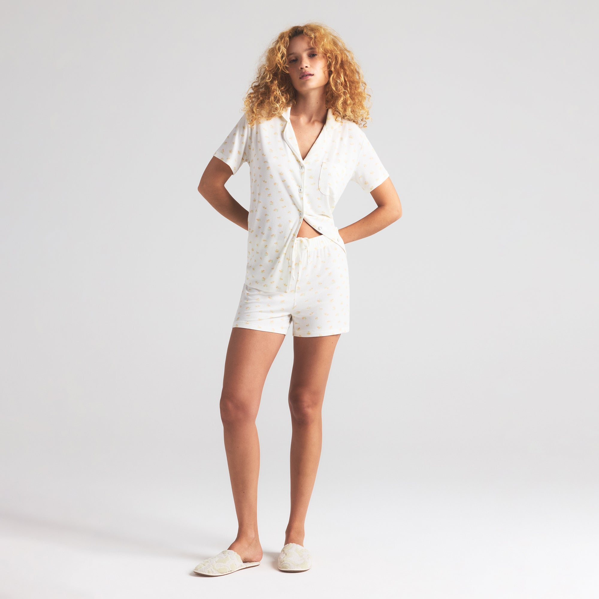 Meet the ultra-soft sleep set of your dreams. This classic button-up sleepwear top and fitted shorts have a classic look and ultra-comfortable feel. Features chest pocket details and interior drawstrings. Fits true to size.