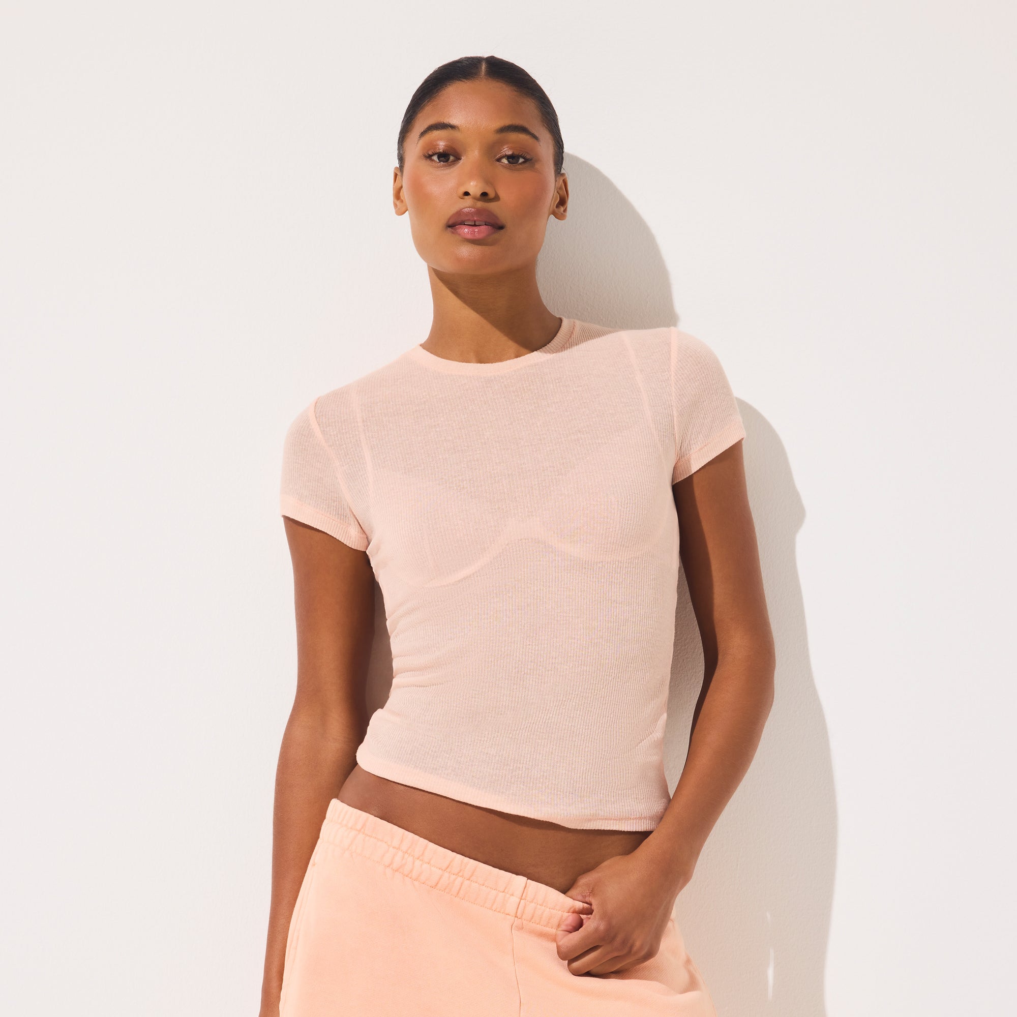 Sexy basics. With its bold, sheer look and slightly drapey fit, this is the elevated essential you’ll reach for every time. Features a high crew neck and fits true to size.