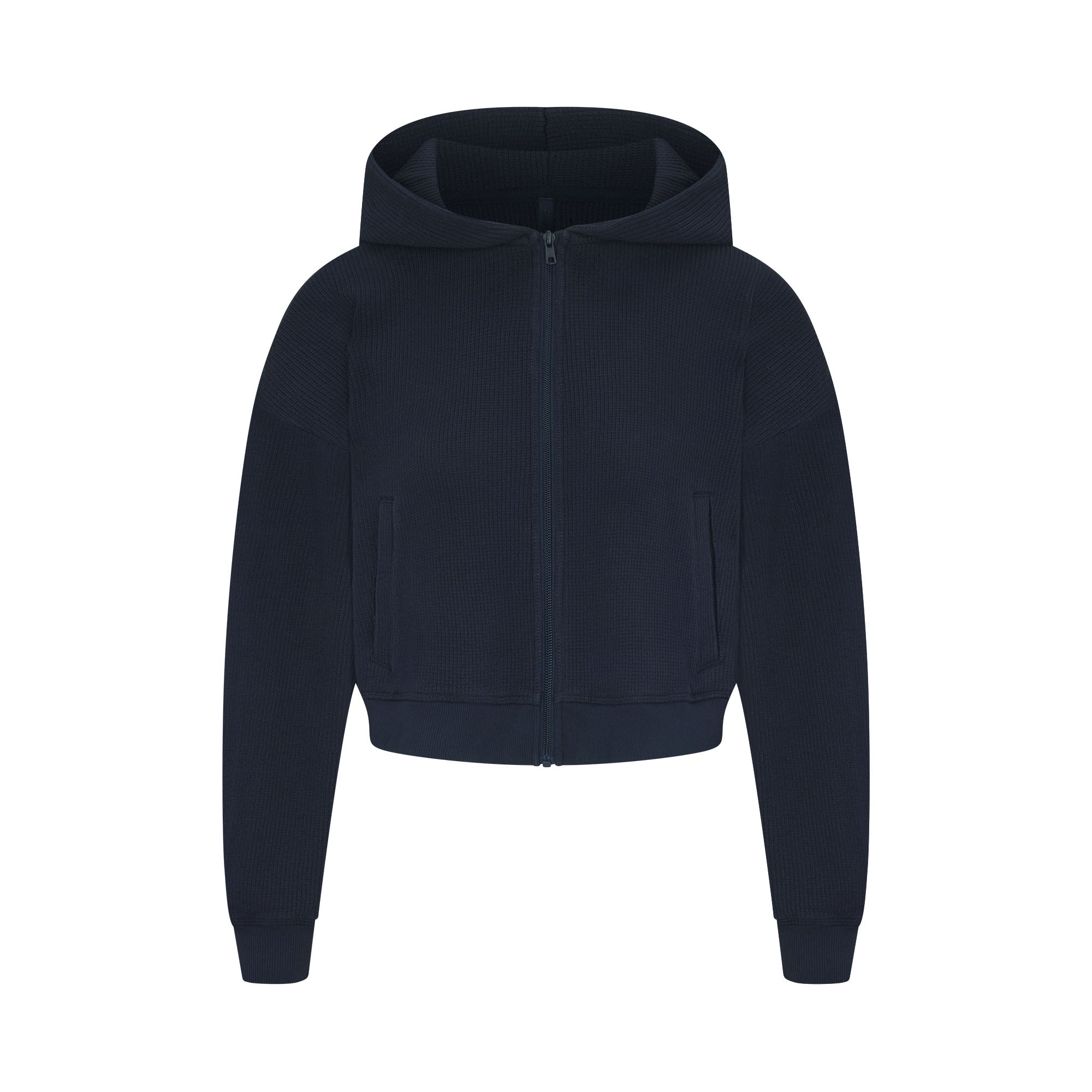 HEAVY WAFFLE CROPPED ZIP UP HOODIE | NAVY