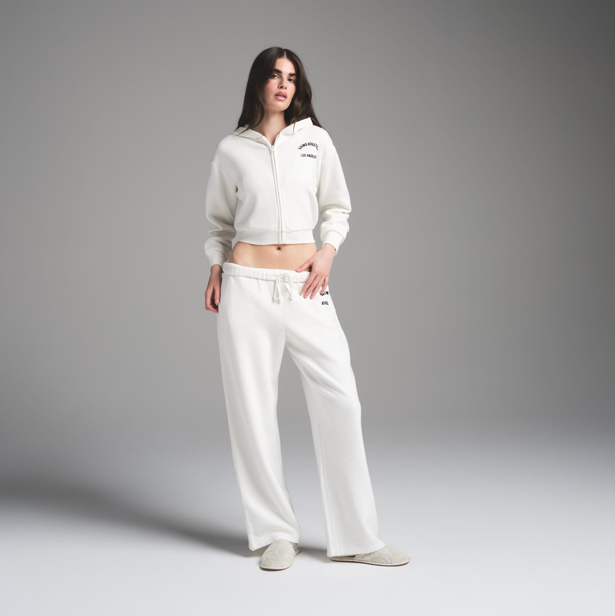 Get comfortable in cloud-like cotton comfort. This cropped, shrunken hoodie is made with our signature, soft fleece and includes an embossed logo on the left sleeve above the cuff. Our navy flocked velvet graphic on the chest adds a sporty twist. Complete with a zipper front and ribbed details on the cuff and hem.