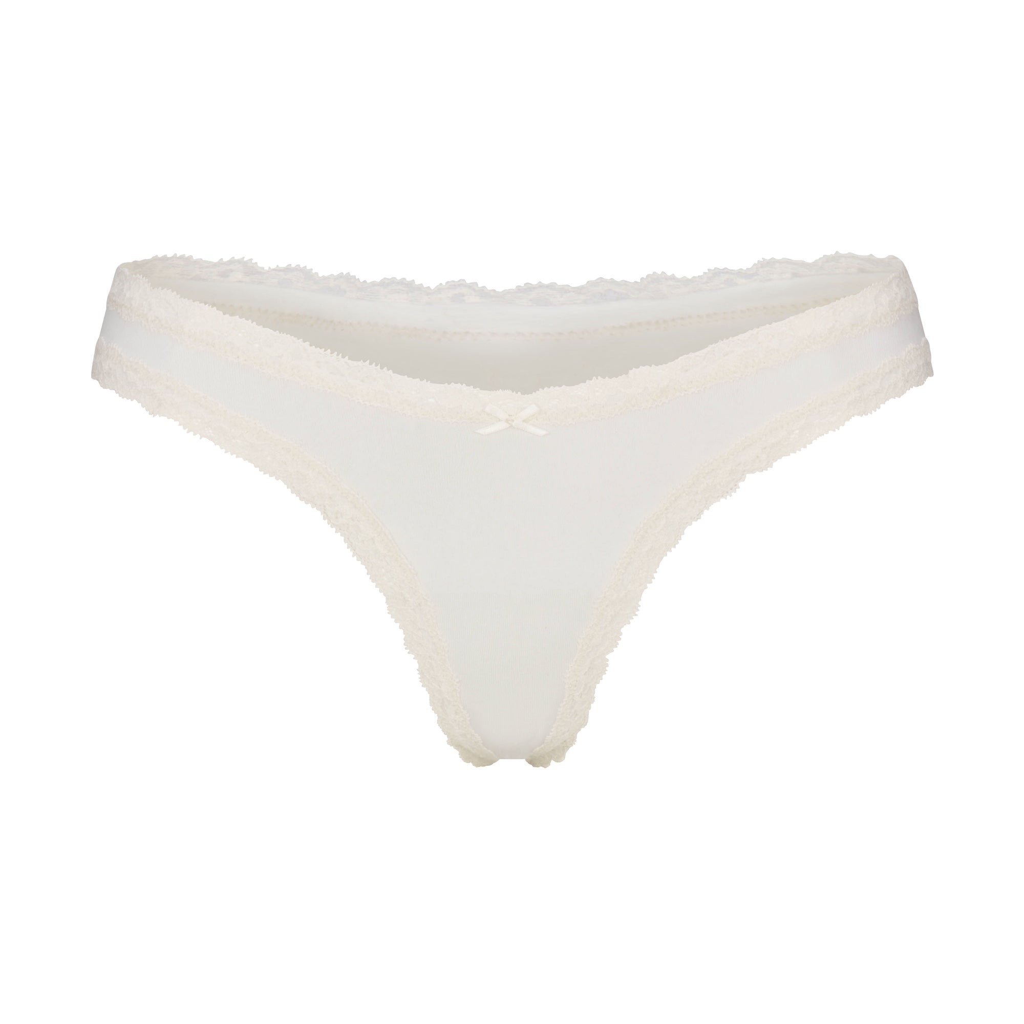 Sweet nothing. Made from lightweight, breathable cotton, this thong features tonal lace trim and a center bow for an ultra-feminine look. Complete with a 100% cotton gusset. Fits true to size.