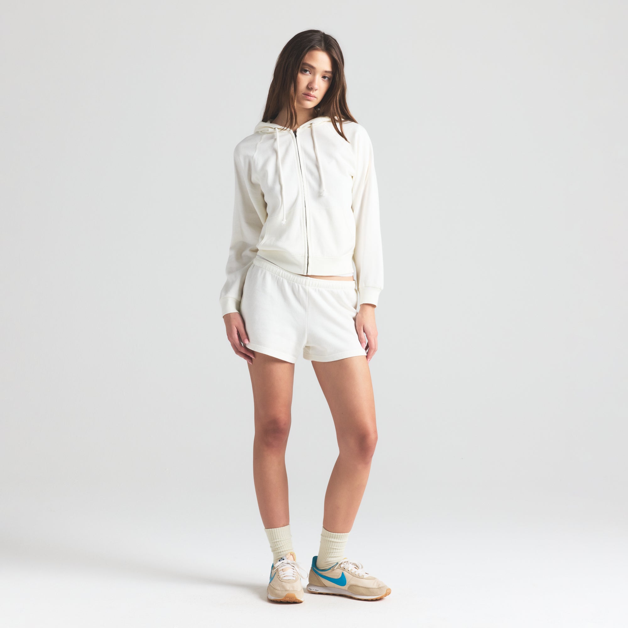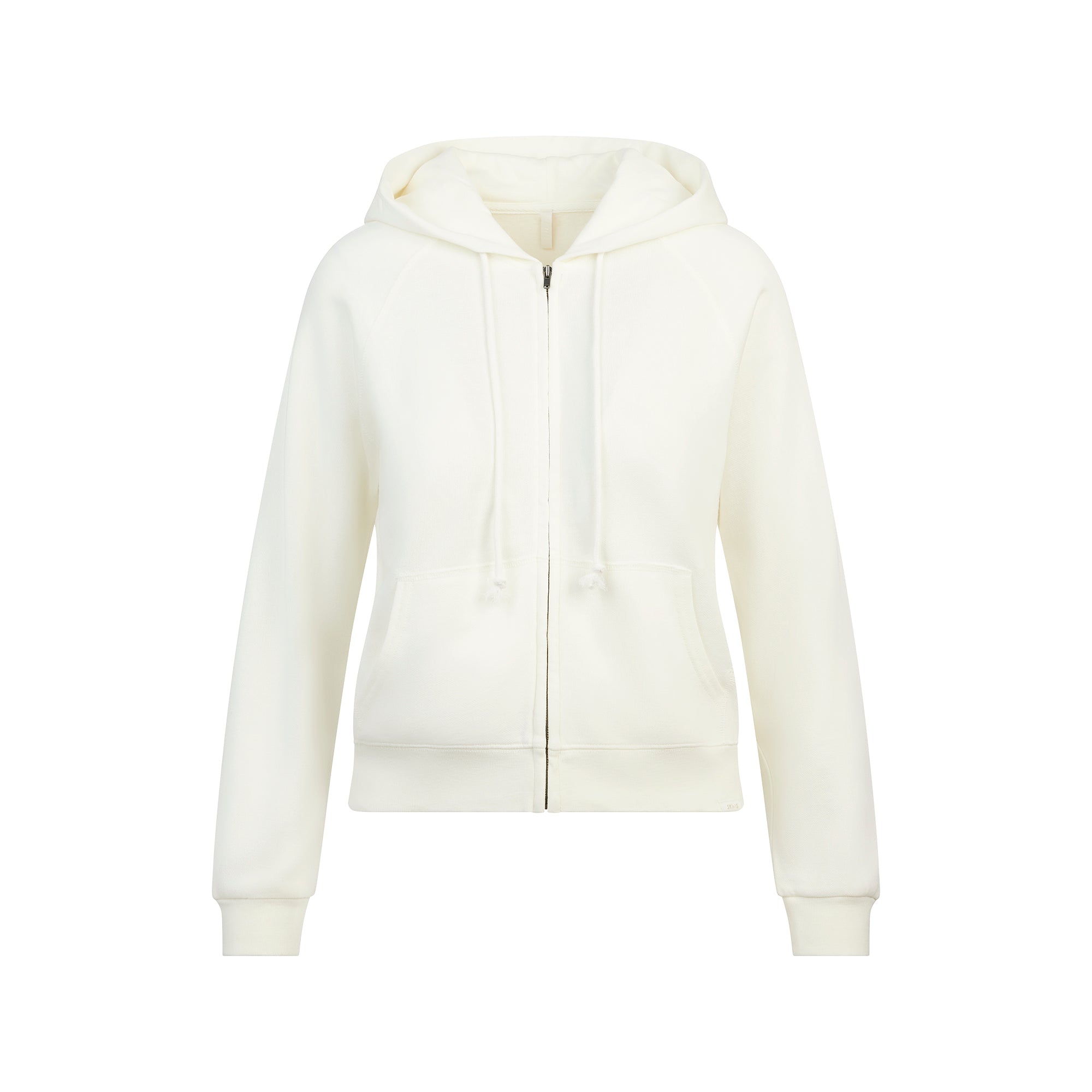 Zip into sporty style. This Lightweight Fleece zip up hoodie brings chic, breathable style to your everyday uniform. Features raglan sleeves, a kangaroo pocket, and drawstring. Complete with ribbed details at the cuff and hem and a SKIMS logo detail the bottom band. Fits true to size.