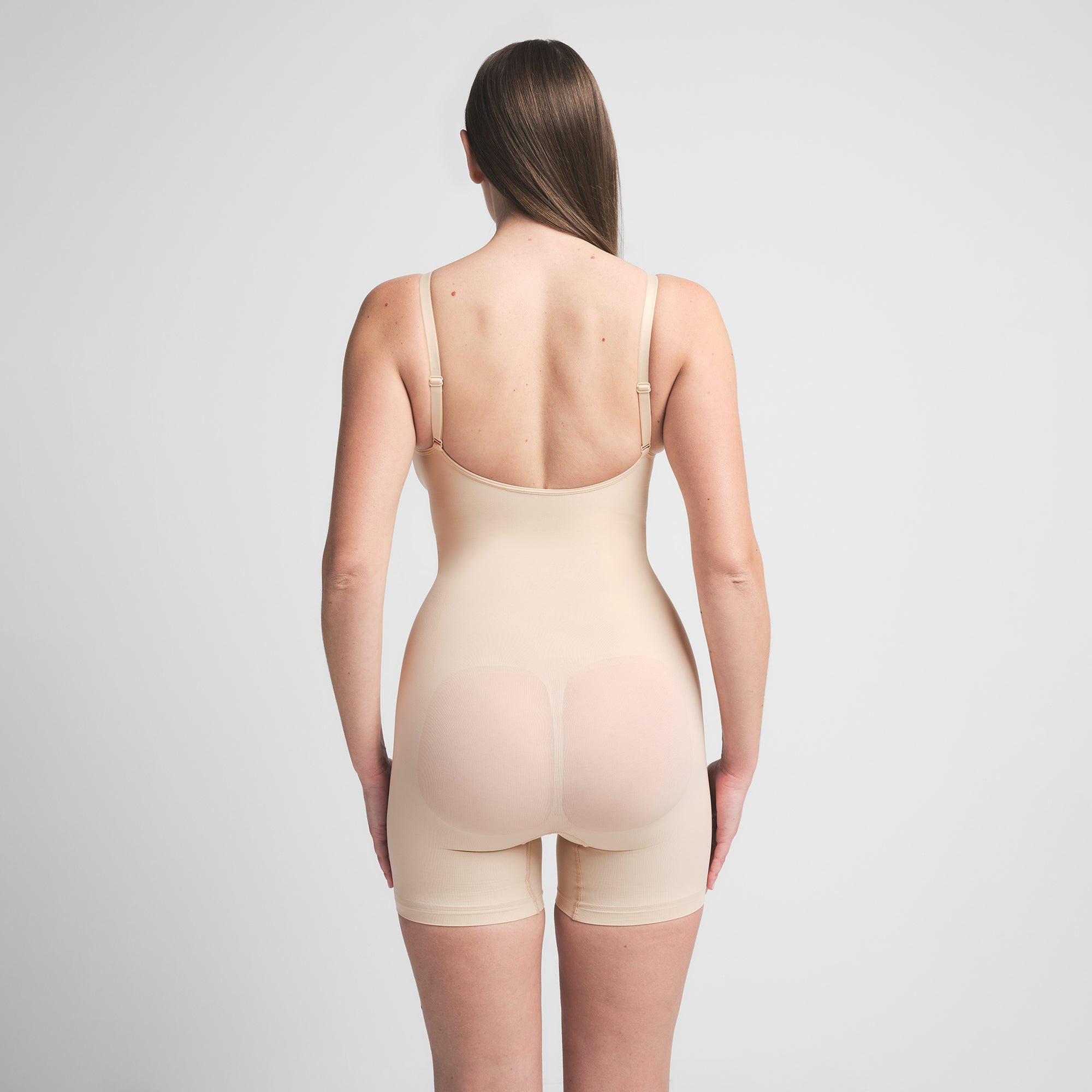 The sculpting bodysuit all over your feed, updated for an even better fit. Wear this mid thigh bodysuit for strong compression and targeted control along the waist, tummy, and legs, plus butt-enhancing pockets for a lifted look. Features front pique stitching along the front and sides for a defined and supported bust, adjustable straps, a wide crotch for added coverage, and an open gusset. Fits true to size.Fits true to size.