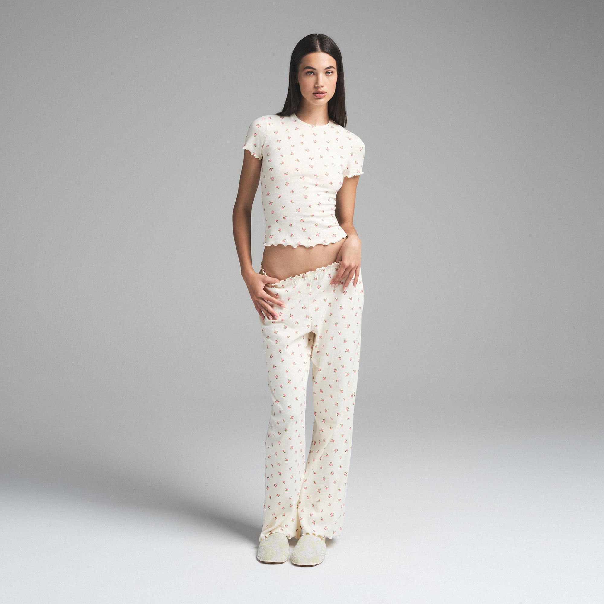 You and this tee are meant to be. Designed in our lightweight pointelle knit fabric, this fitted, crewneck style is perfect for relaxing or everyday wear. Features a repeating SKIMS logo and small eyelet holes that add texture.